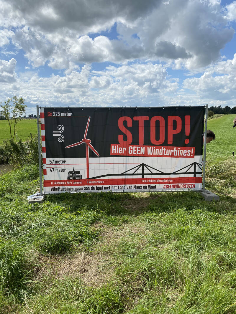 Op zaterdag 7 augustus jl. hebben enkele bezorgde omwonenden aandacht gevraagd voor een slecht plan. Het plaatsen van windturbines rondom de Grote Wetering. Er zijn spandoeken geplaatst op de hoek van de Zwaanheuvelstraat/Veesteeg, Hoogbroekstraat/Zijweg en Liesbroekstraat/ Nieuwe Weg. Het is belangrijk dat heel West Maas en Waal op de hoogte is van deze slechte plannen! Is dit het begin van een breder openbaar protest? #geenwindreuzen